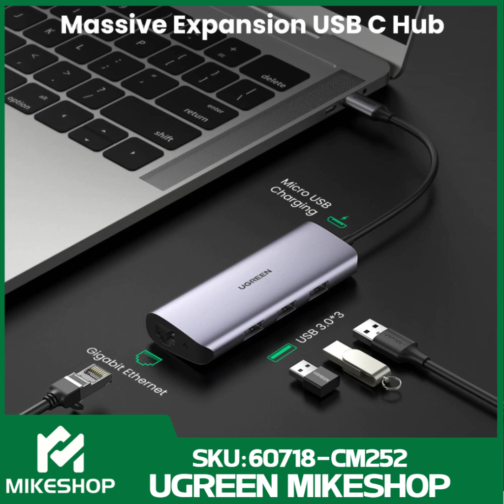 UGREEN USB-C Hub con 3 puertos USB 3.0 hembra, puerto Ethernet de 1000 Mbps y 1 puerto de fuente de alimentación Micro USB, expande increíblemente la conectividad de tu Macbook.